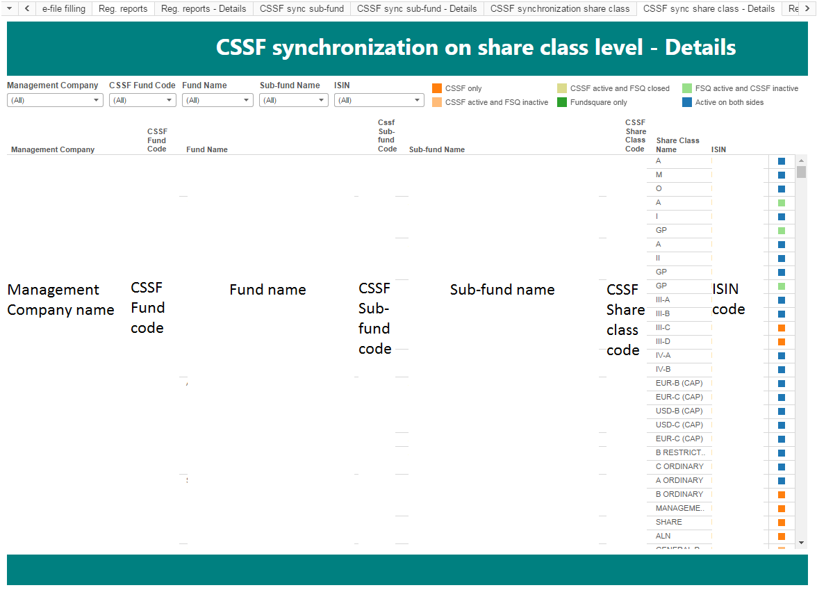 The “CSSF synchronization on share class level” view shows for fund you are servicing using Fundsquare the synchronization between CSSF and Fundsquare with regards to the status of the share classes.