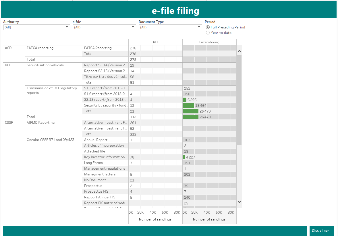 - The columns indicating a country (Luxembourg) count documents that are issued by fund and display the number of documents under that fund domicile.