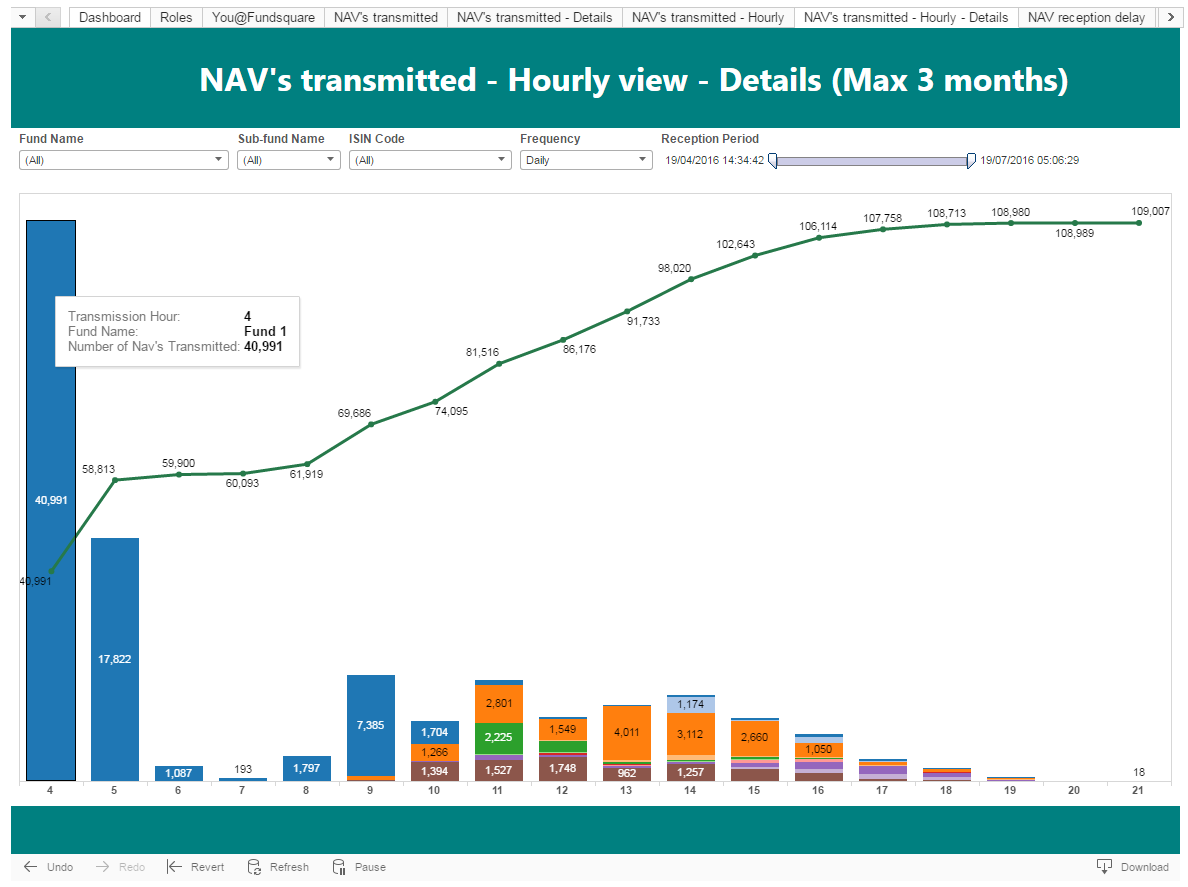 The “NAV’s transmitted to Fundsquare” view represents the number of NAV’s transmitted to Fundsquare for each fund every day.