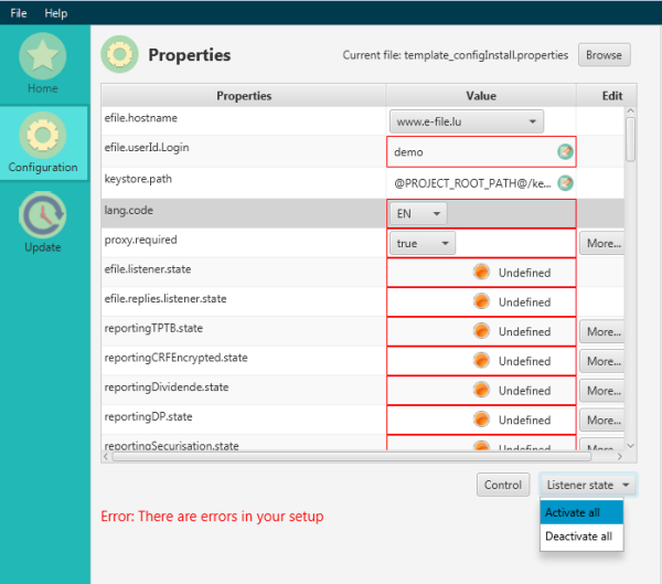 - Adjust the properties file to redirect the service to our test environment : Homologation. e-file.hostname = homologation.e-file.lu