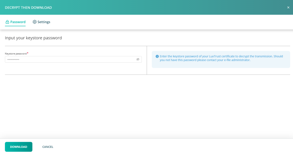 the drawer “Decrypt then Download” opens. The user must enter the Keystore password to decrypt and download the document, see images below.