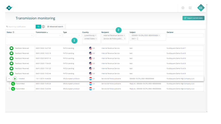 There is an « Export current data » button that download the list of transmissions currently displayed on the screen in an Excel sheet