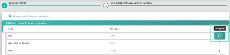 Upon click on “De-registration” the user must select one of the funds. There is an action: “Deregister”